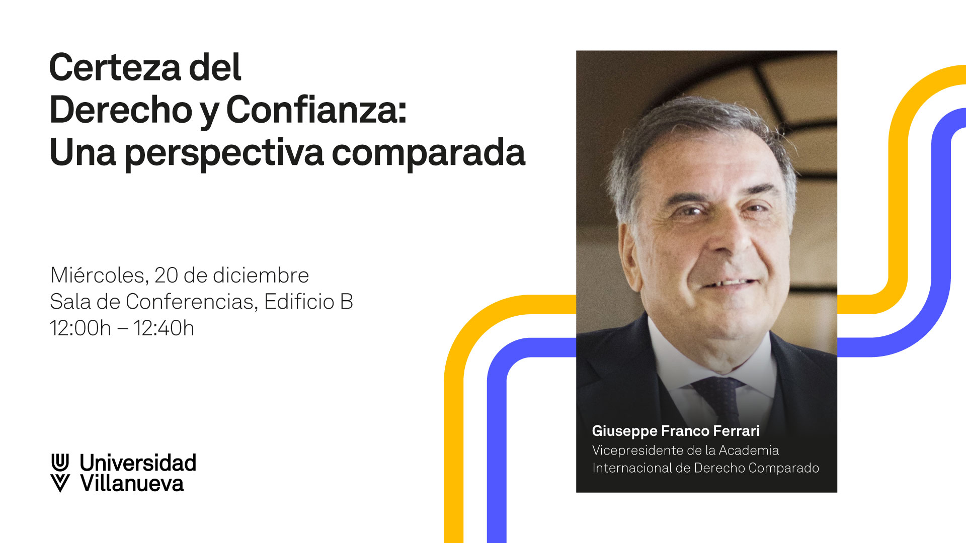 En el marco de la Cátedra de Calidad Democrática que gestiona el Instituto para el Buen Gobierno y la Calidad Democrática de la Universidad Villanueva, se desarrollará la conferencia titulada: «Certeza del Derecho y Confianza: Una perspectiva comparada», dictada por el catedrático italiano, Giuseppe Franco Ferrari, quien es profesor de Derecho Público Comparado de la Universidad de Bocconi, en Milan, y Vicepresidente de la Academia Internacional de Derecho Comparado.
