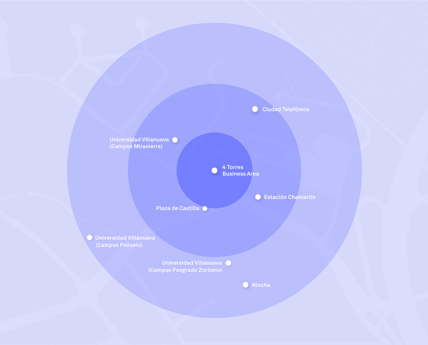 La Universidad Villanueva consta de tres campus muy cercanos al centro de negocios de Madrid y están conectados con los puntos de interés de la capital.