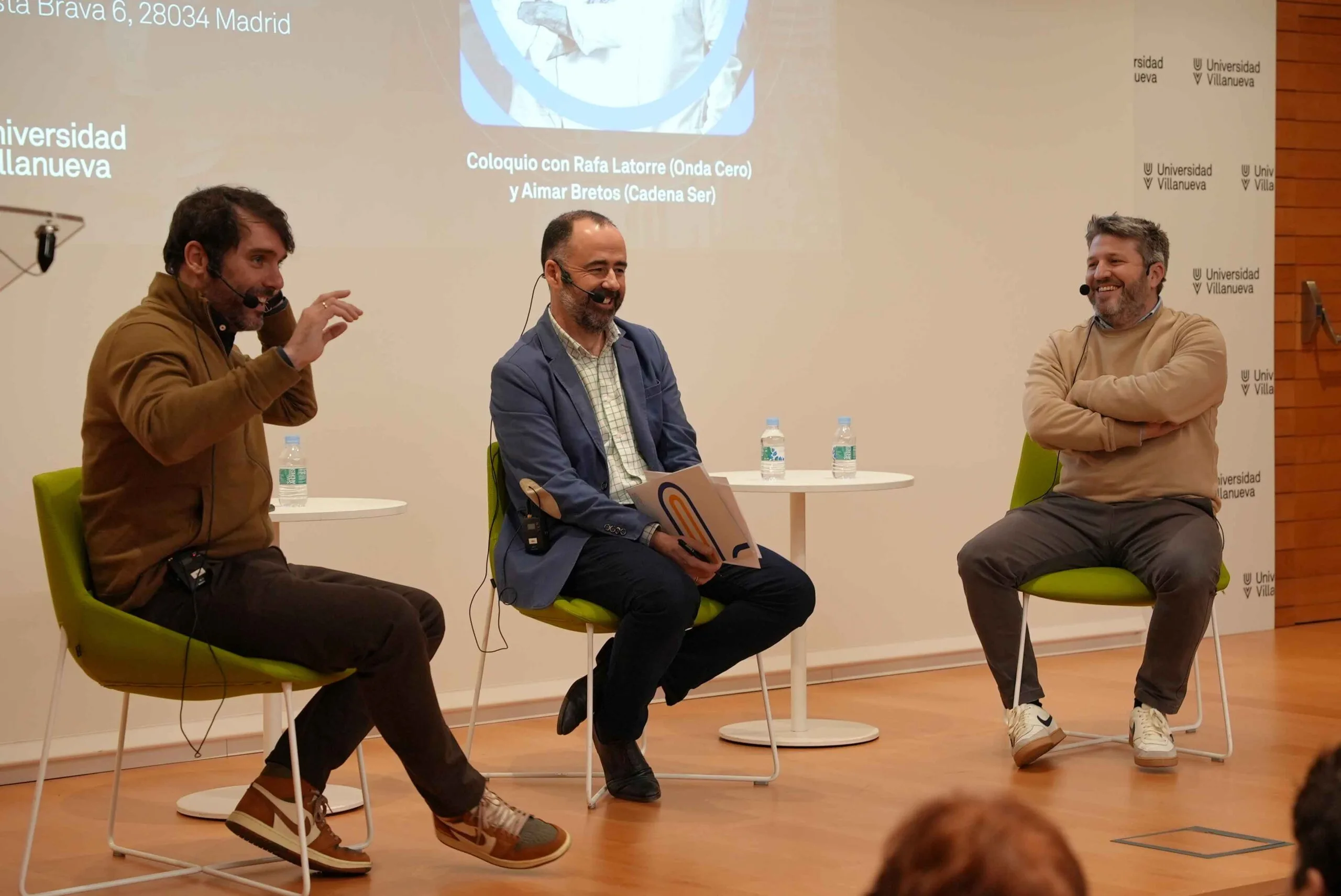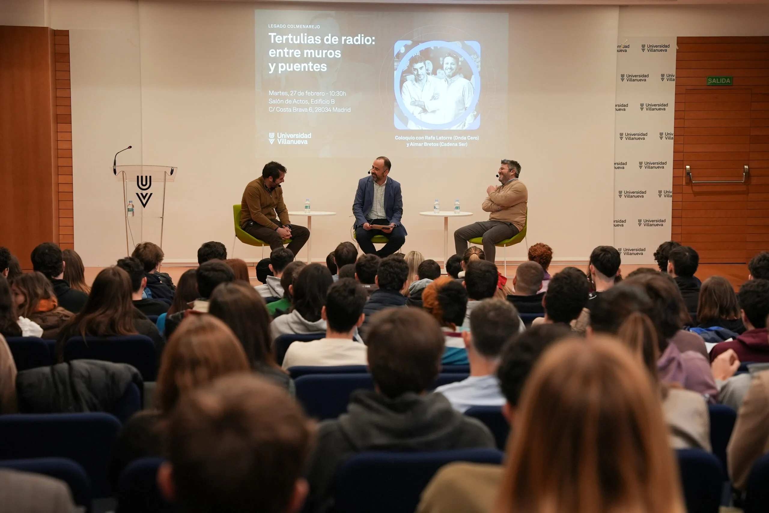 Moderados por Ernesto Villar, profesor y director del Grado en Periodismo, el coloquio, que llevaba como titular “Tertulias de radio: entre muros y puentes”, se convirtió en una auténtica lección de buen periodismo. Se habló de de polarización, de democracia y de libertad; del ruido de las redes sociales; de la responsabilidad del periodista, especialmente en la radio, para crear espacios “acogedores” y tender puentes; de la manipulación y la guerra digital…